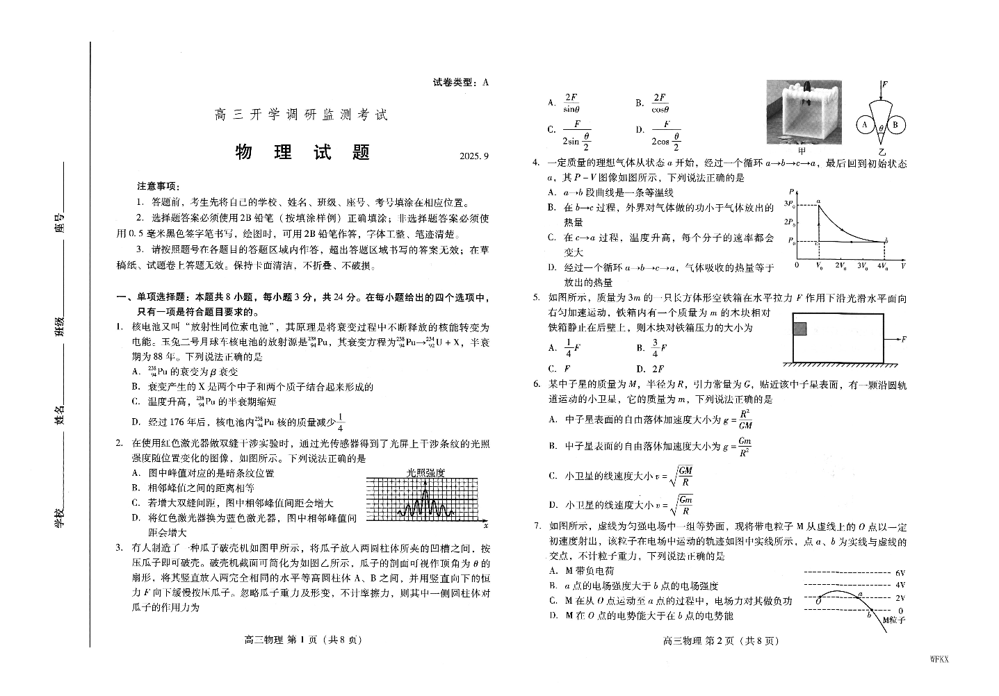 高三物理--山东省潍坊市2025.9高三开学调研监测考试