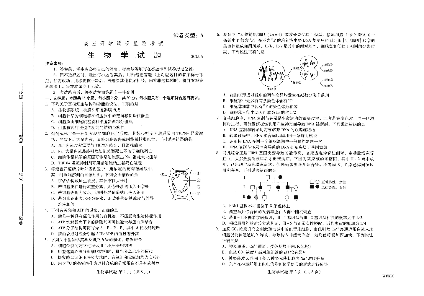 高三生物--山东省潍坊市2025.9高三开学调研监测考试