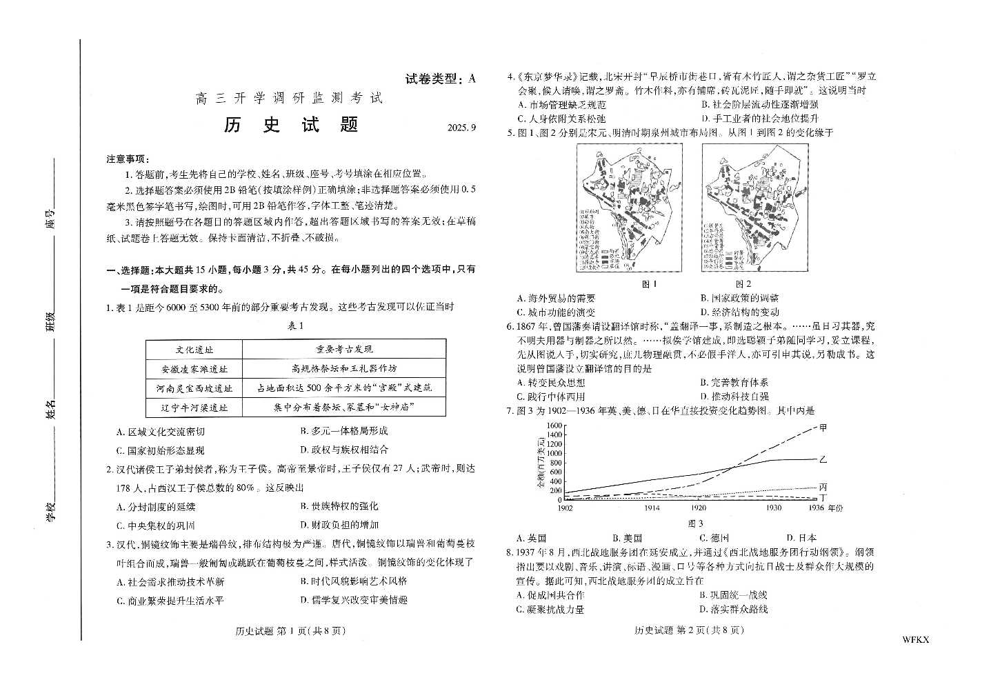 高三历史--山东省潍坊市2025.9高三开学调研监测考试