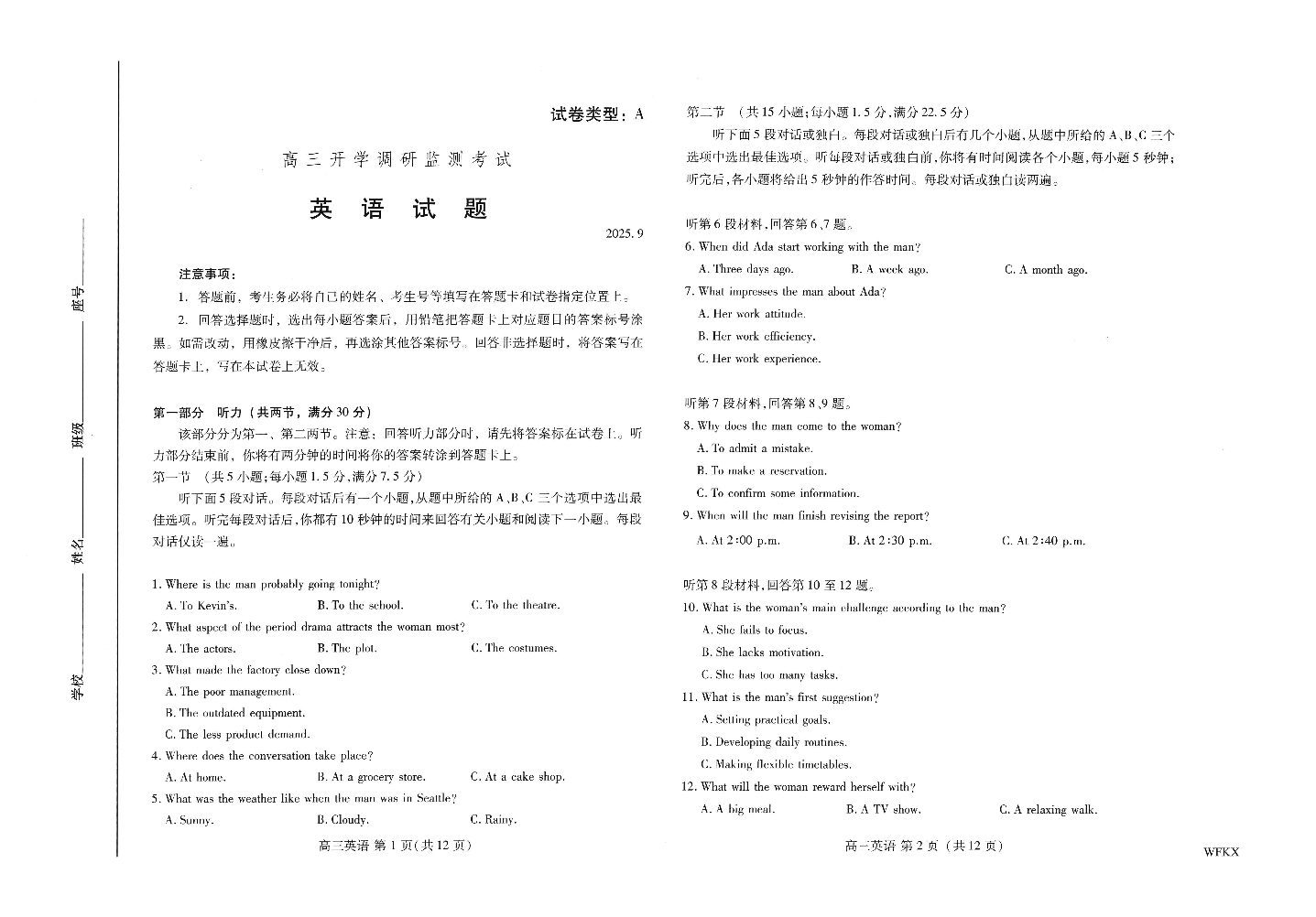 高三英语(山东省潍坊市2025.9开学调研监测)