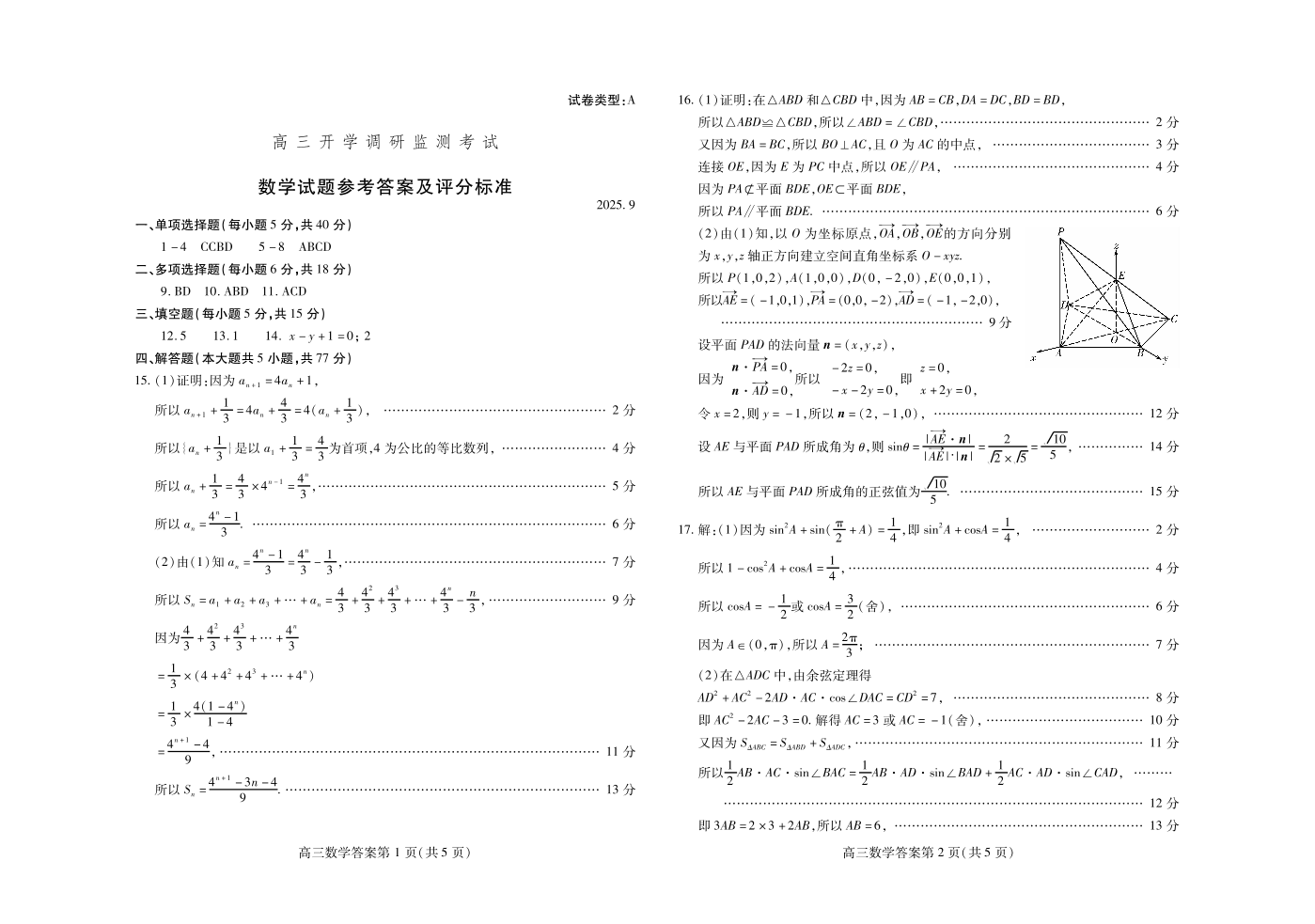 高三数学答案(山东省潍坊市2025.9开学调研监测)