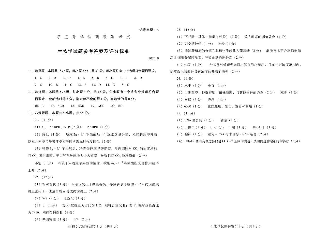 高三生物答案(山东省潍坊市2025.9开学调研监测)