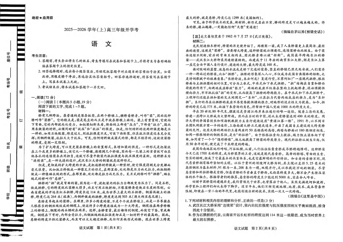 高三语文--河南省天一大联考2025—2026学年(上)高三年级9月开学考