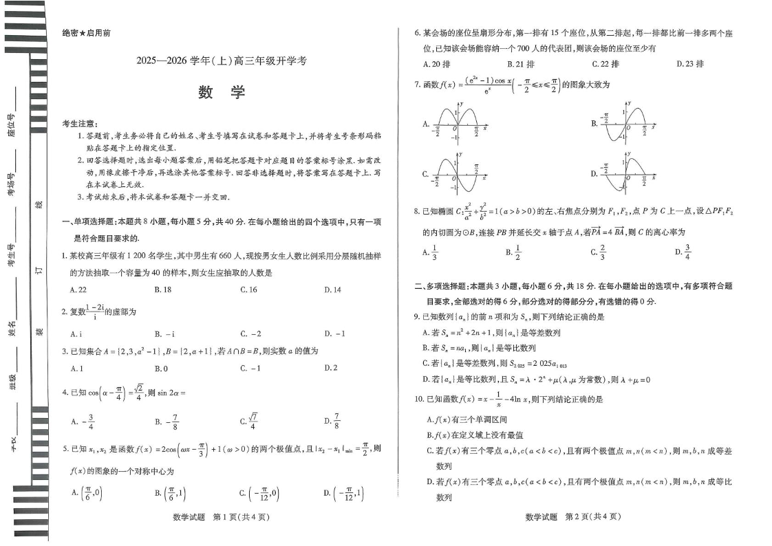 高三数学--河南省天一大联考2025—2026学年(上)高三年级9月开学考