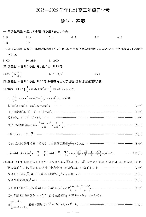 高三数学答案--河南省天一大联考2025—2026学年(上)高三年级9月开学考