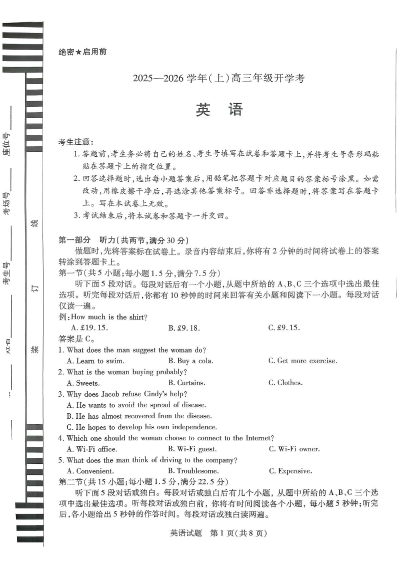 高三英语--河南省天一大联考2025—2026学年(上)高三年级9月开学考