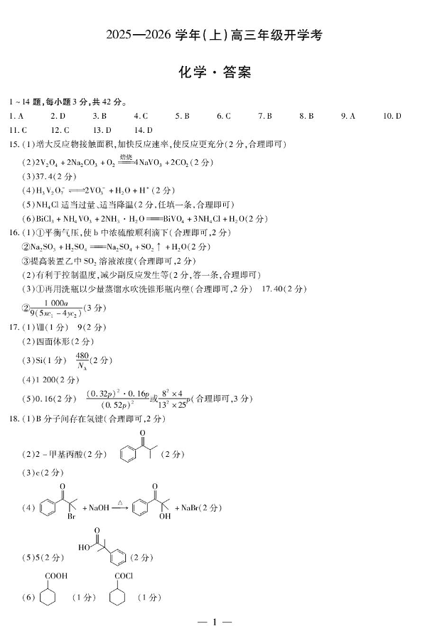 高三化学答案--河南省天一大联考2025—2026学年(上)高三年级9月开学考