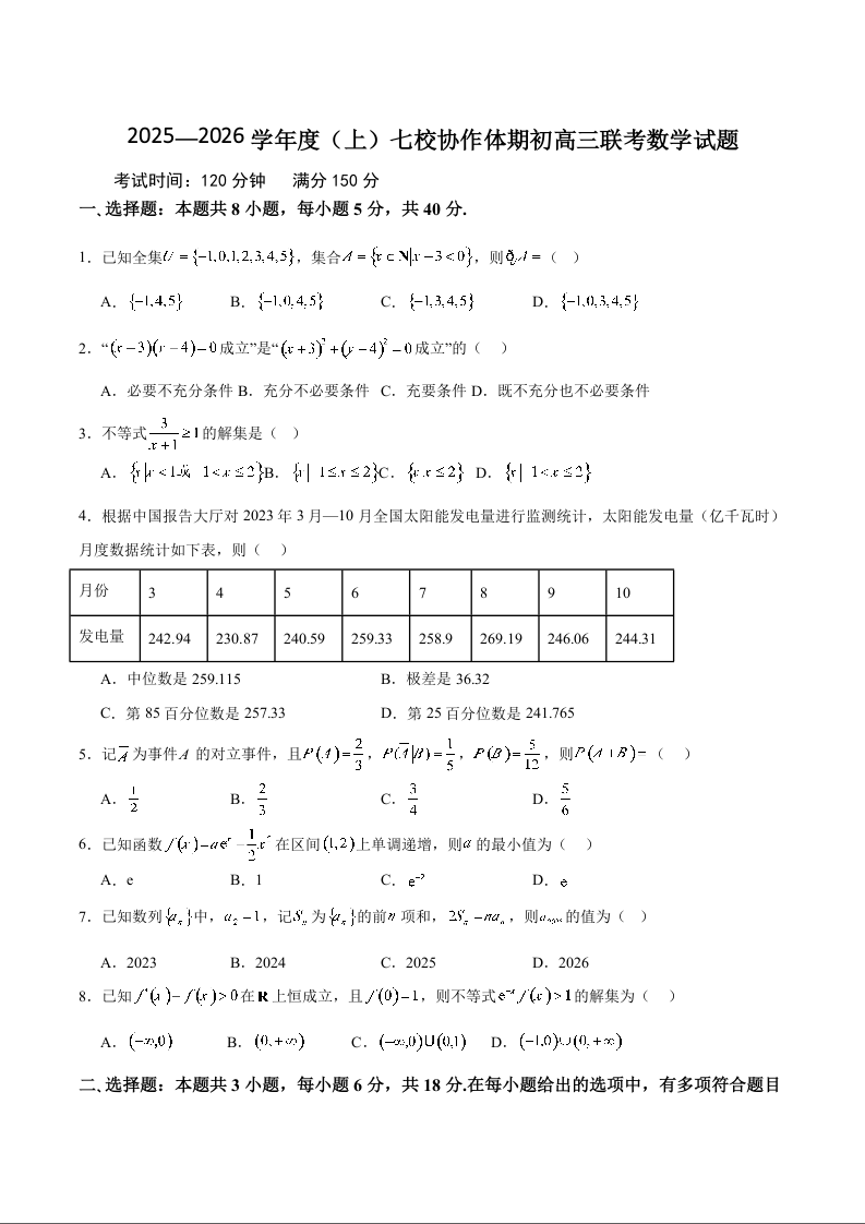 高三数学+答案--辽宁省七校协作体2026届高三上学期期初联考