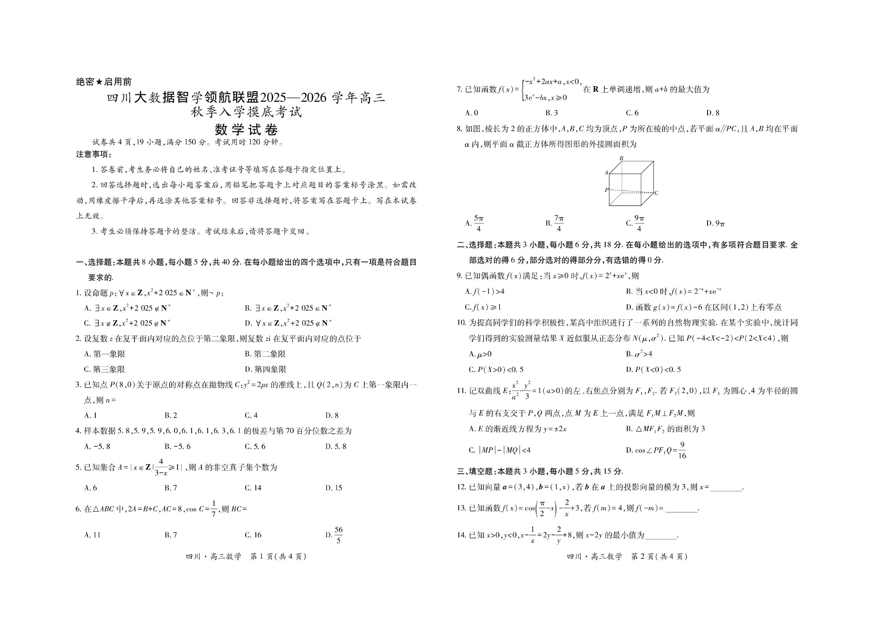 高三数学+答案--四川省大数据智学领航联盟2026届高三上学期9月开学考试