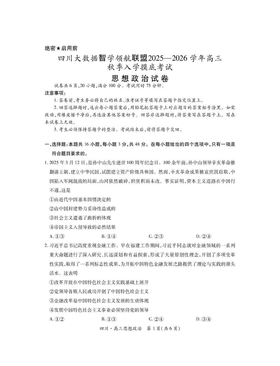 高三政治+答案--四川省大数据智学领航联盟2026届高三上学期9月开学考试