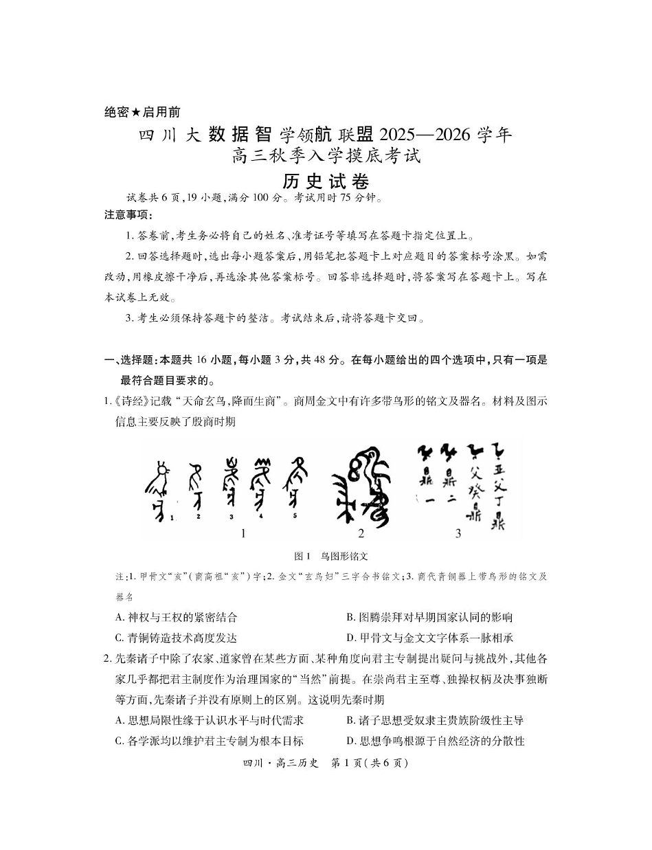高三历史+答案--四川省大数据智学领航联盟2026届高三上学期9月开学考试
