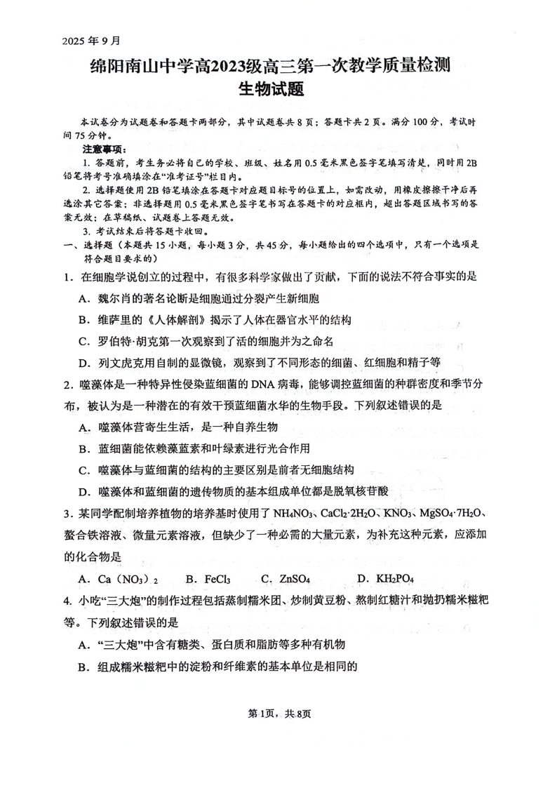 高三生物+答案--四川省绵阳南山中学2026届高三上学期第一次教学质量检测