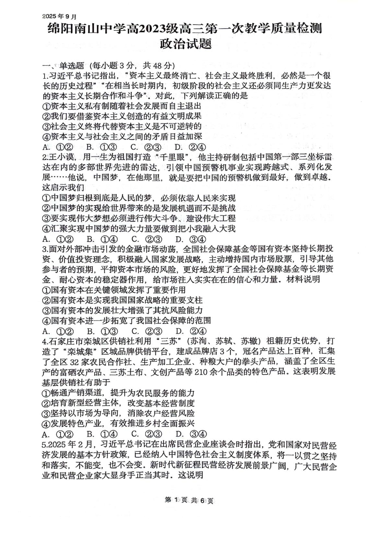 高三政治+答案--四川省绵阳南山中学2026届高三上学期第一次教学质量检测