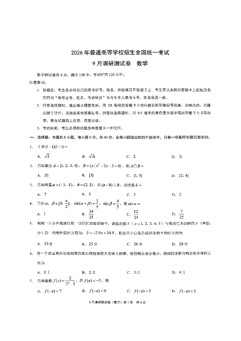 高三数学--重庆市2026年普通高等学校招生全国统一考试9月调研测试(康德卷)