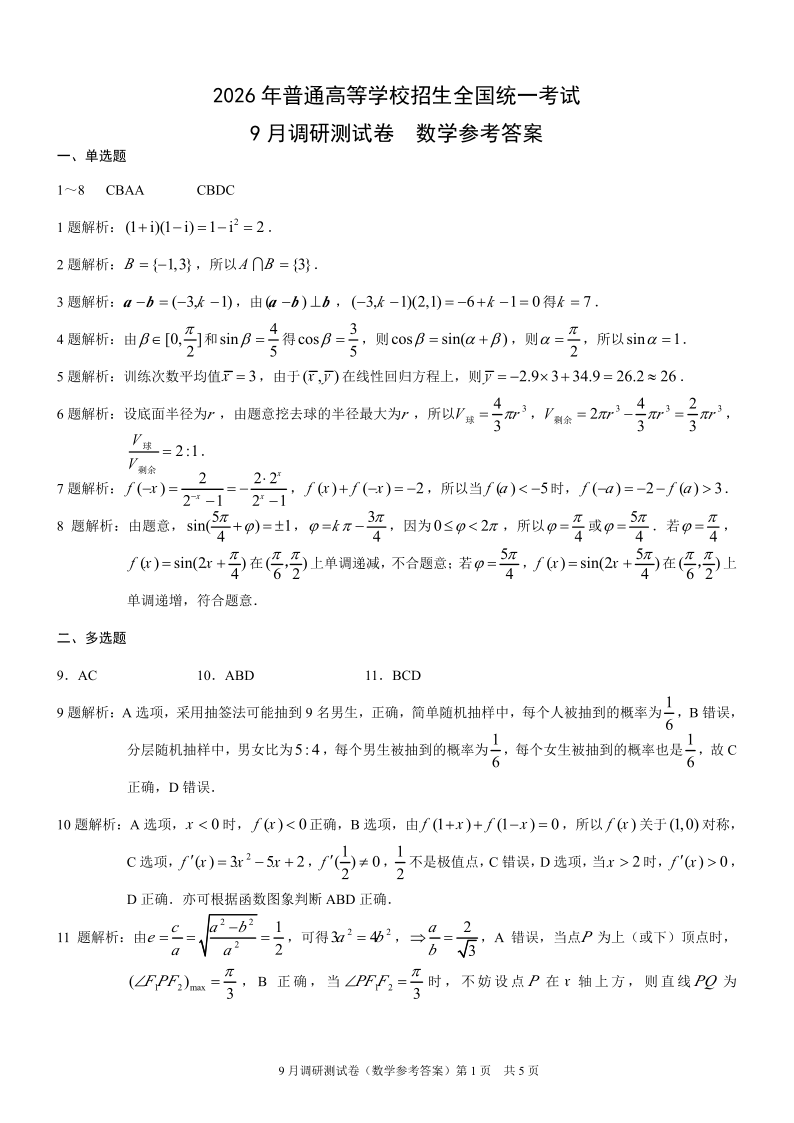 高三数学答案--重庆市2026年普通高等学校招生全国统一考试9月调研测试(康德卷)