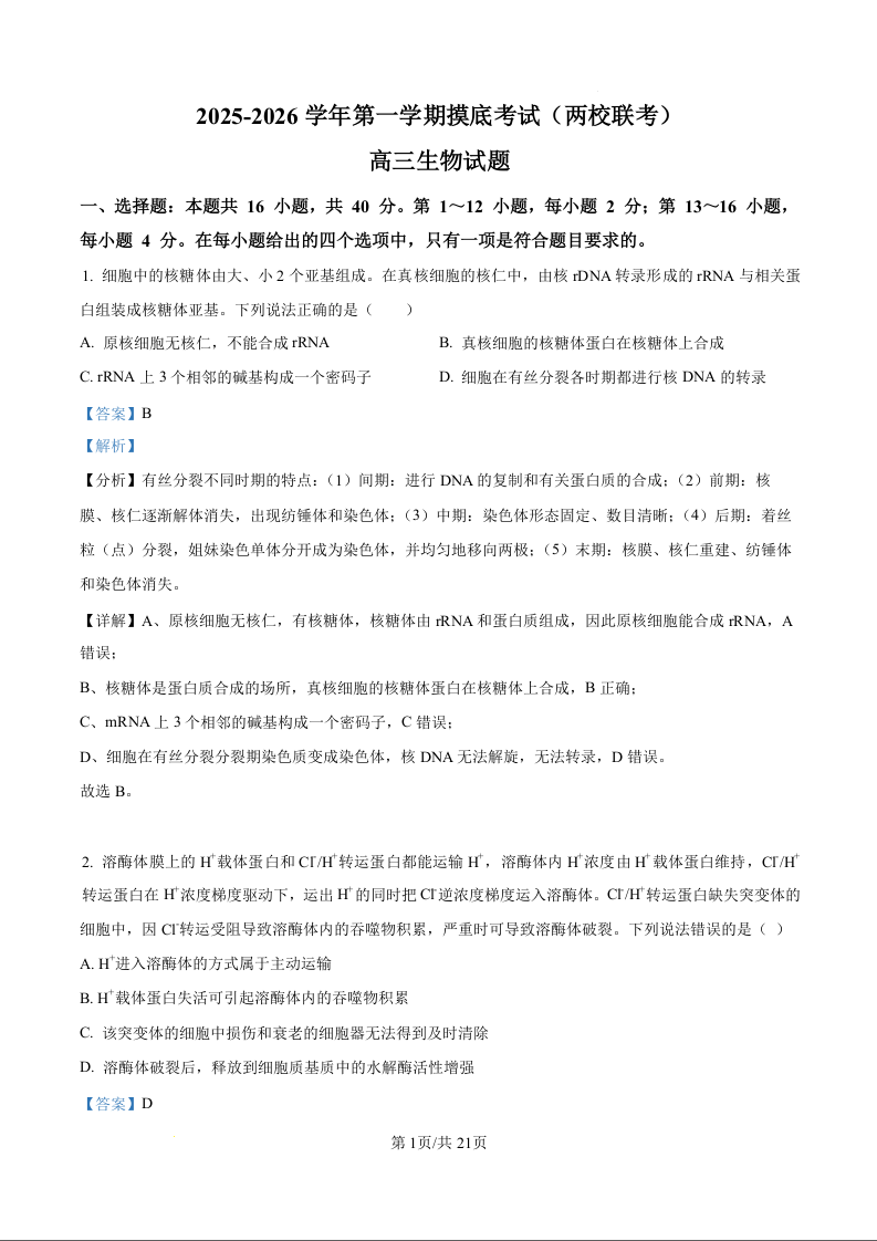 高三生物(解析版)--广东省揭阳市一中、新城惠来一中2026届高三上学期8月开学联考