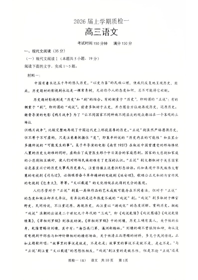 高三语文--河北省衡水市高中联考2026届高三上学期质检(一)(开学考试)