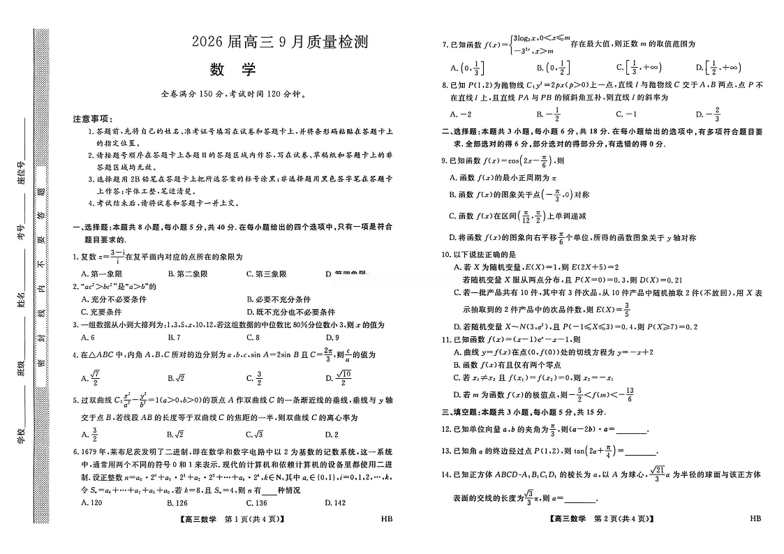 高三数学--河北省金科大联考2026届高三9月质量检测