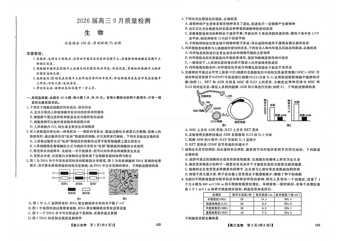 高三生物--河北省金科大联考2026届高三9月质量检测