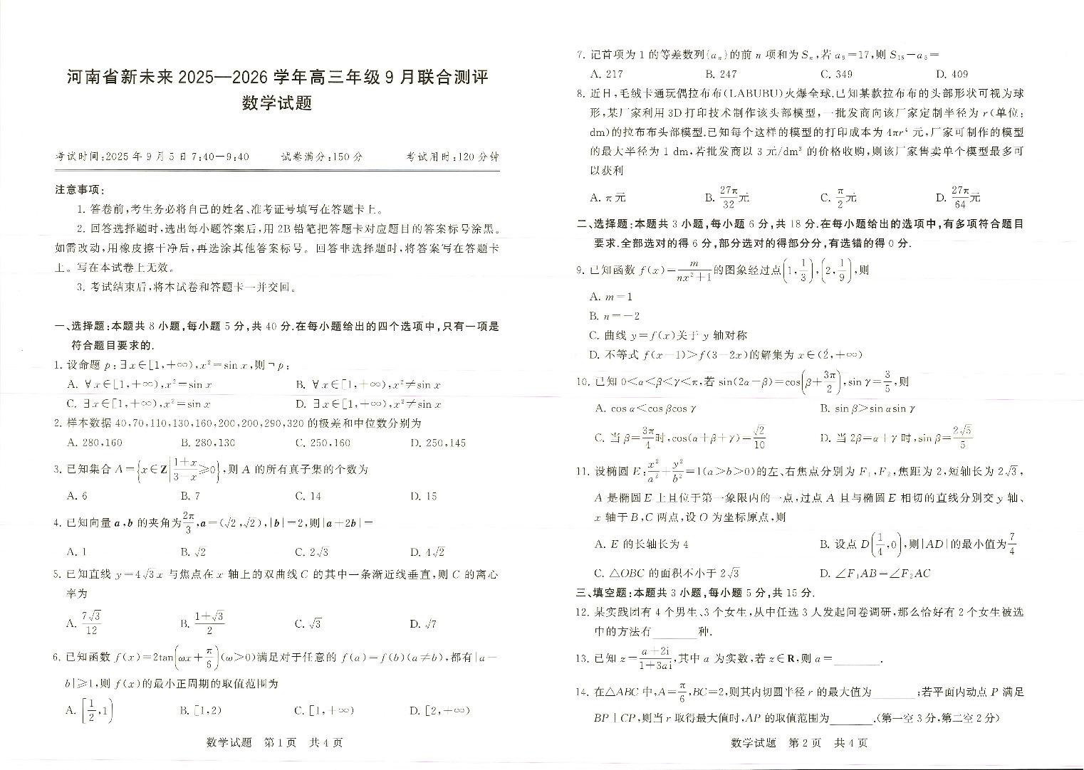 高三数学--河南省新未来2026届高三年级上学期9月份联合测评