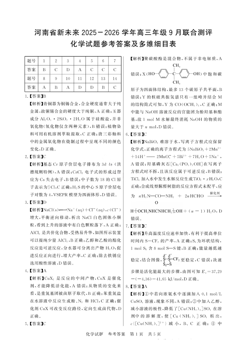高三化学答案--河南省新未来2026届高三年级上学期9月份联合测评