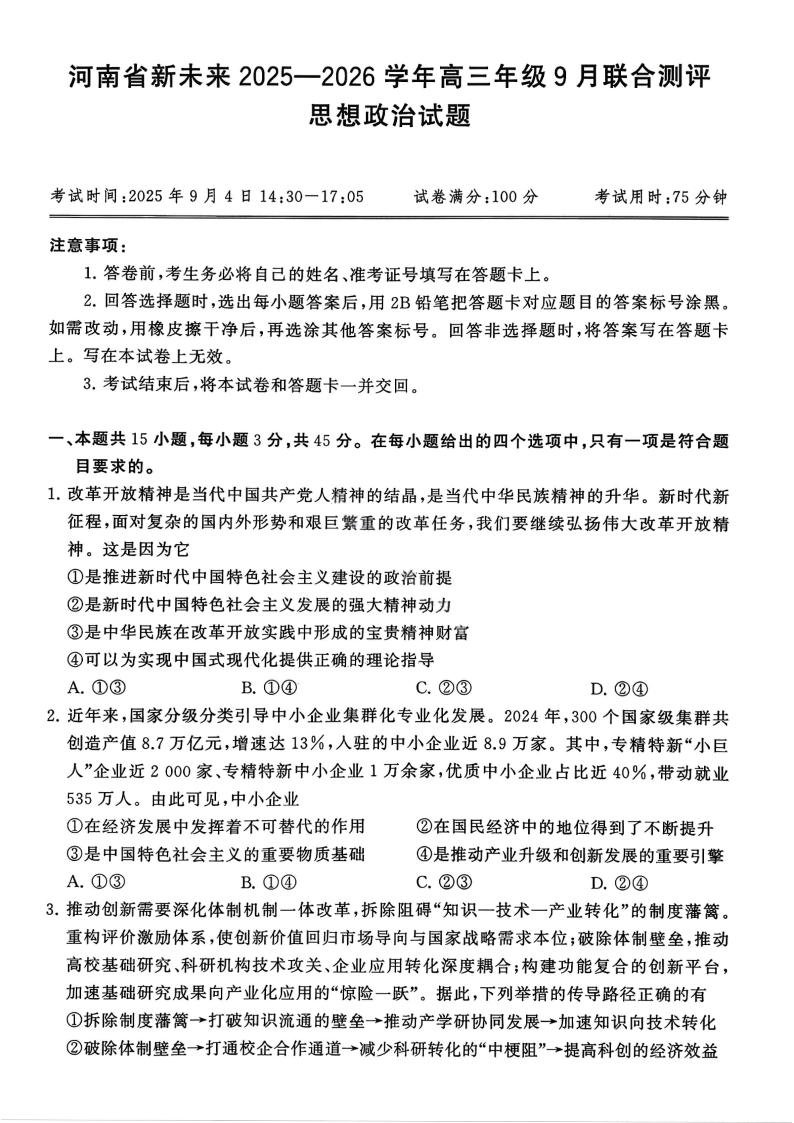 高三政治--河南省新未来2026届高三年级上学期9月份联合测评