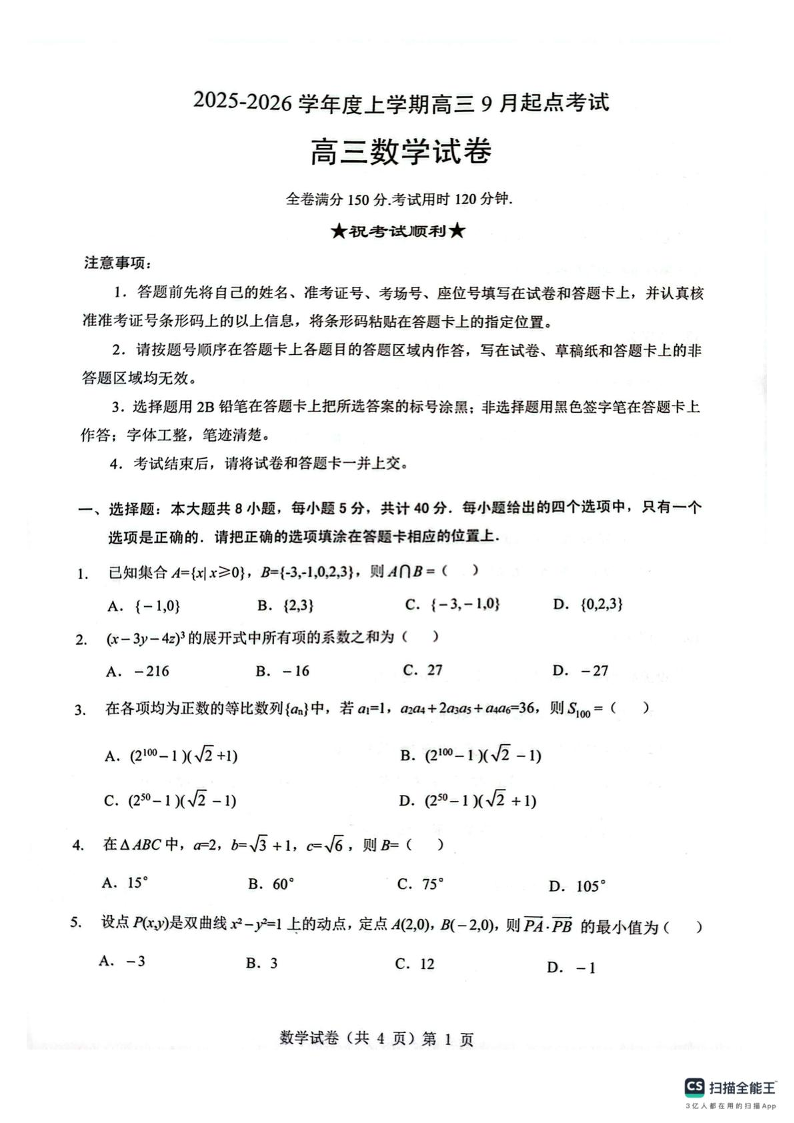 高三数学--湖北省楚天协作体2026届高三上学期9月起点考试