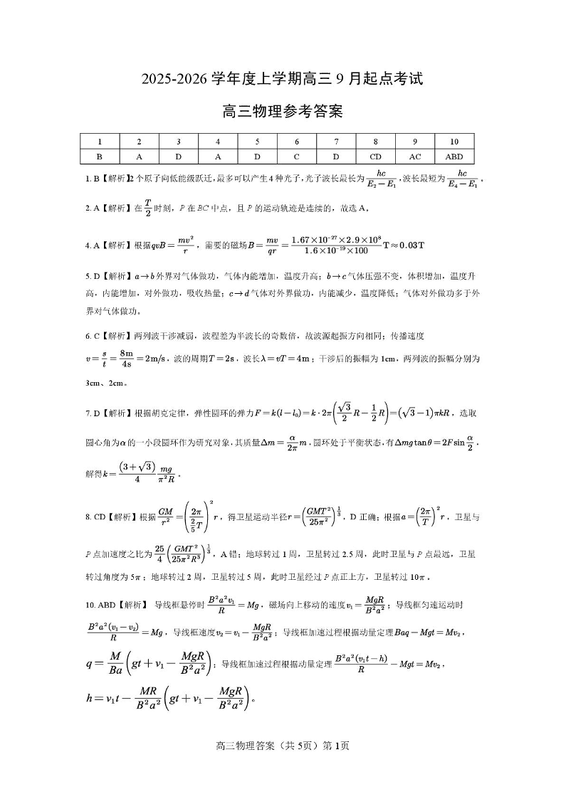 高三物理答案--湖北省楚天协作体2026届高三上学期9月起点考试