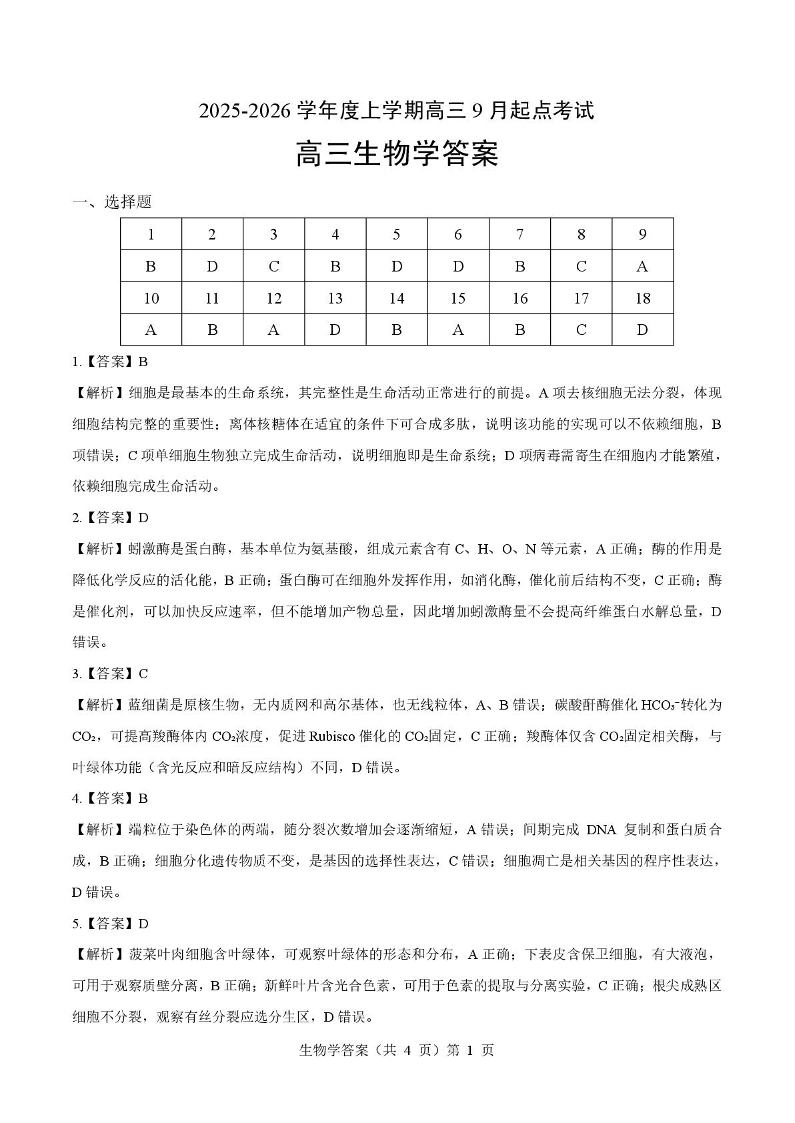 高三生物答案--湖北省楚天协作体2026届高三上学期9月起点考试