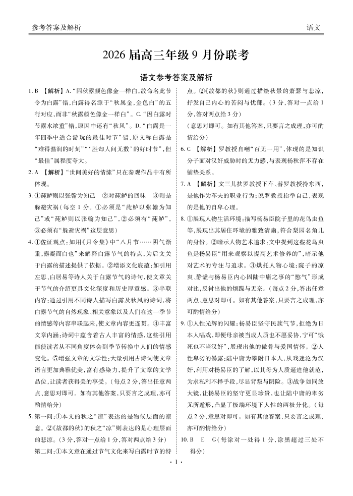 高三语文答案--衡水金卷2026届高三年级9月份联考(云南、广东、四川、黑龙江、河南、陕西等地)