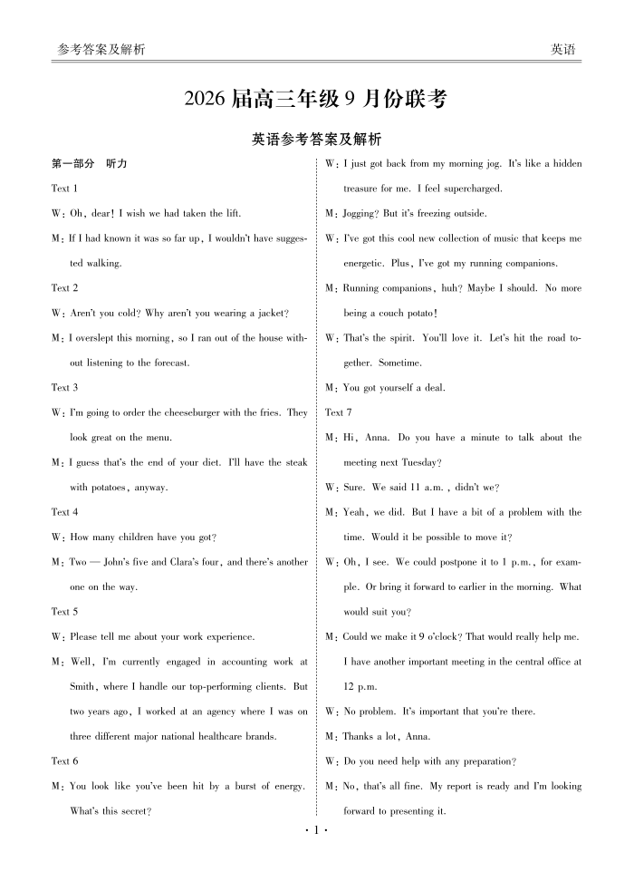 高三英语答案--衡水金卷2026届高三年级9月份联考(云南、广东、四川、黑龙江、河南、陕西等地)