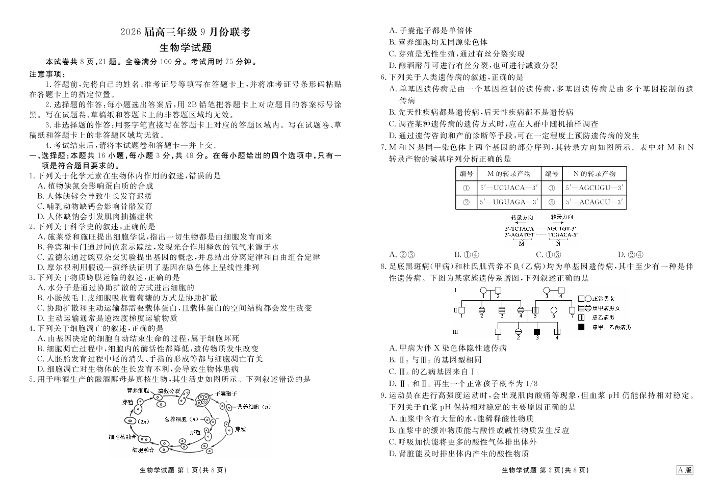 高三生物A卷--衡水金卷2026届高三年级9月份联考(云南、广东、四川、黑龙江、河南、陕西等地)