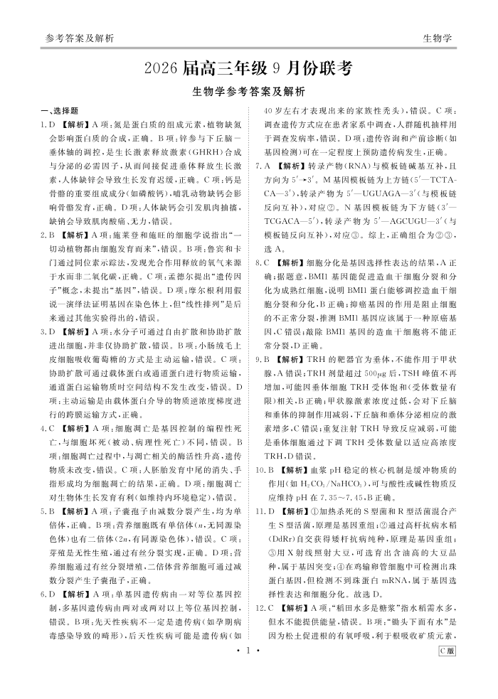 高三生物答案C卷--衡水金卷2026届高三年级9月份联考(云南、广东、四川、黑龙江、河南、陕西等地)