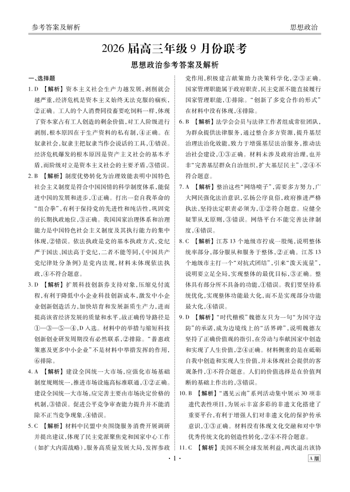 高三政治答案A卷--衡水金卷2026届高三年级9月份联考(云南、广东、四川、黑龙江、河南、陕西等地)