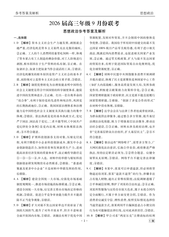 高三政治答案C卷--衡水金卷2026届高三年级9月份联考(云南、广东、四川、黑龙江、河南、陕西等地)