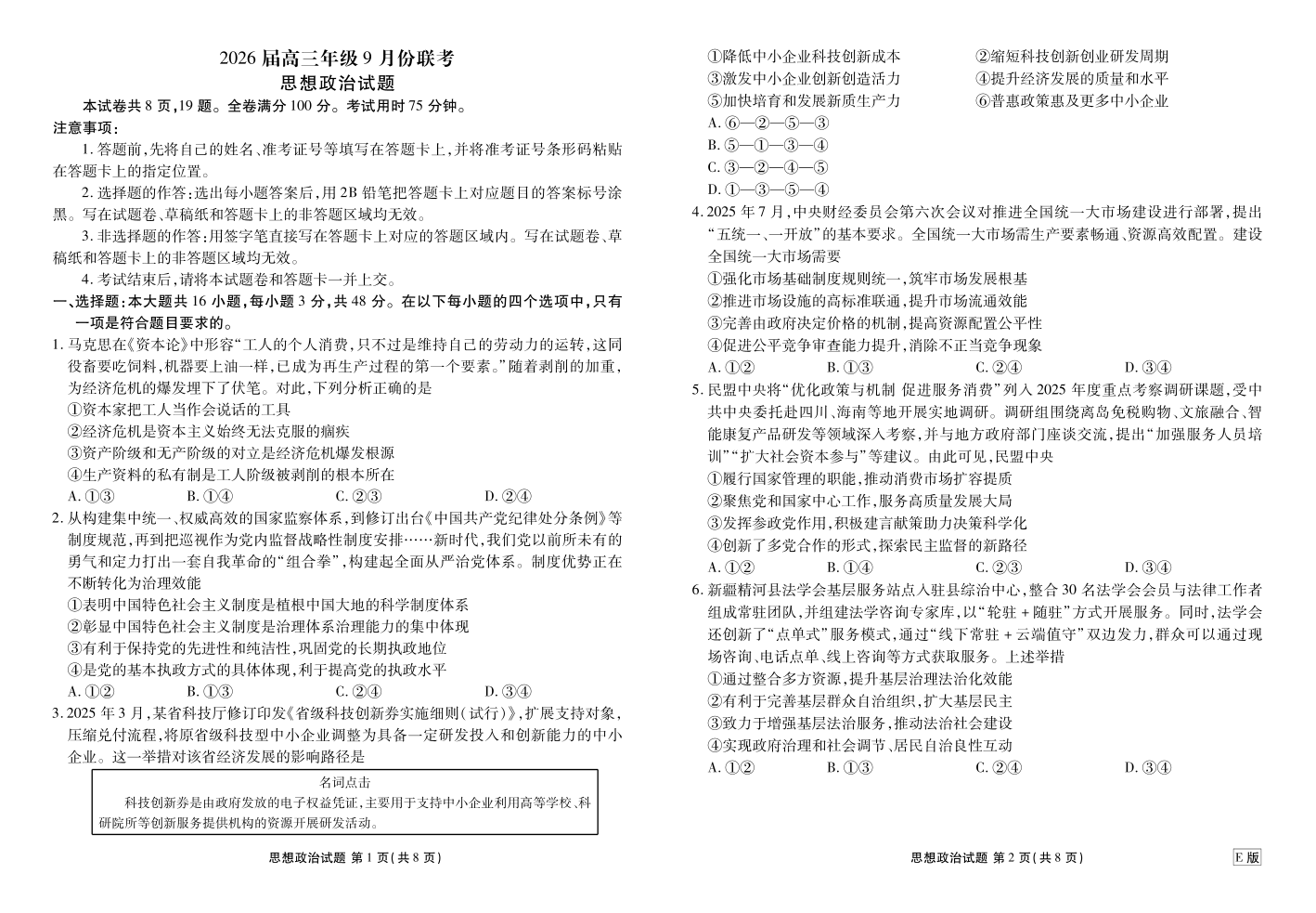 高三政治E卷--衡水金卷2026届高三年级9月份联考(云南、广东、四川、黑龙江、河南、陕西等地)
