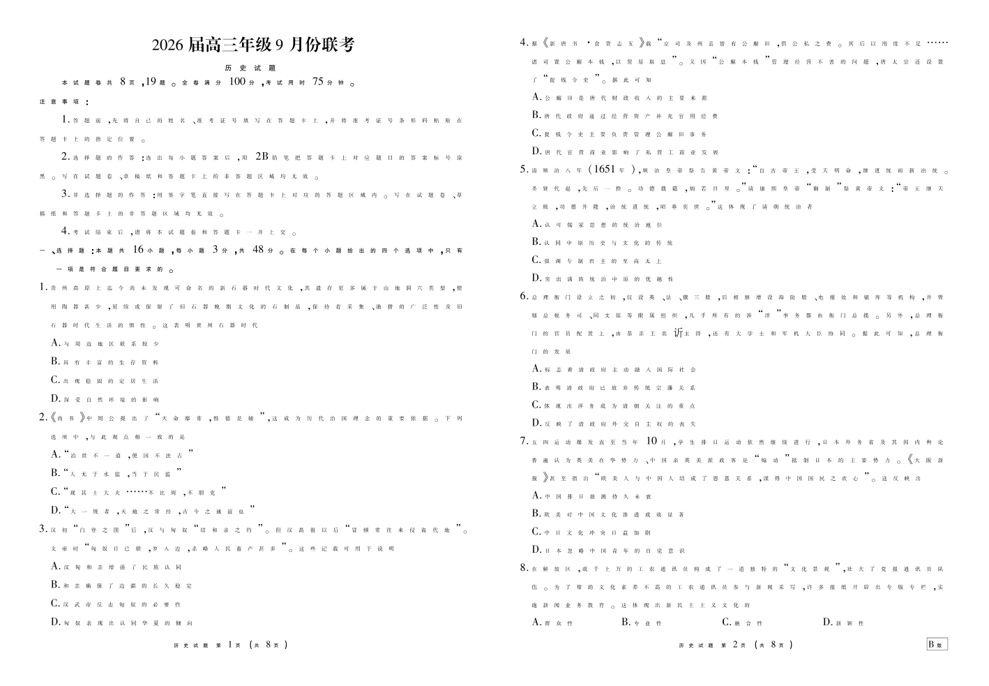 高三历史B卷--衡水金卷2026届高三年级9月份联考(云南、广东、四川、黑龙江、河南、陕西等地)