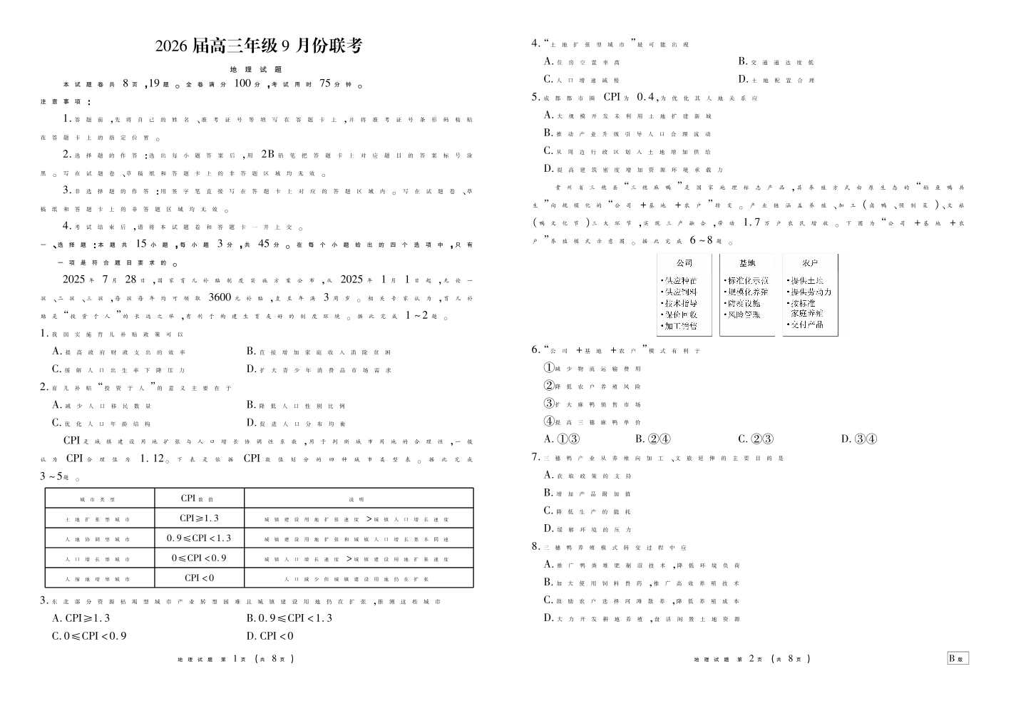 高三地理B卷--衡水金卷2026届高三年级9月份联考(云南、广东、四川、黑龙江、河南、陕西等地)