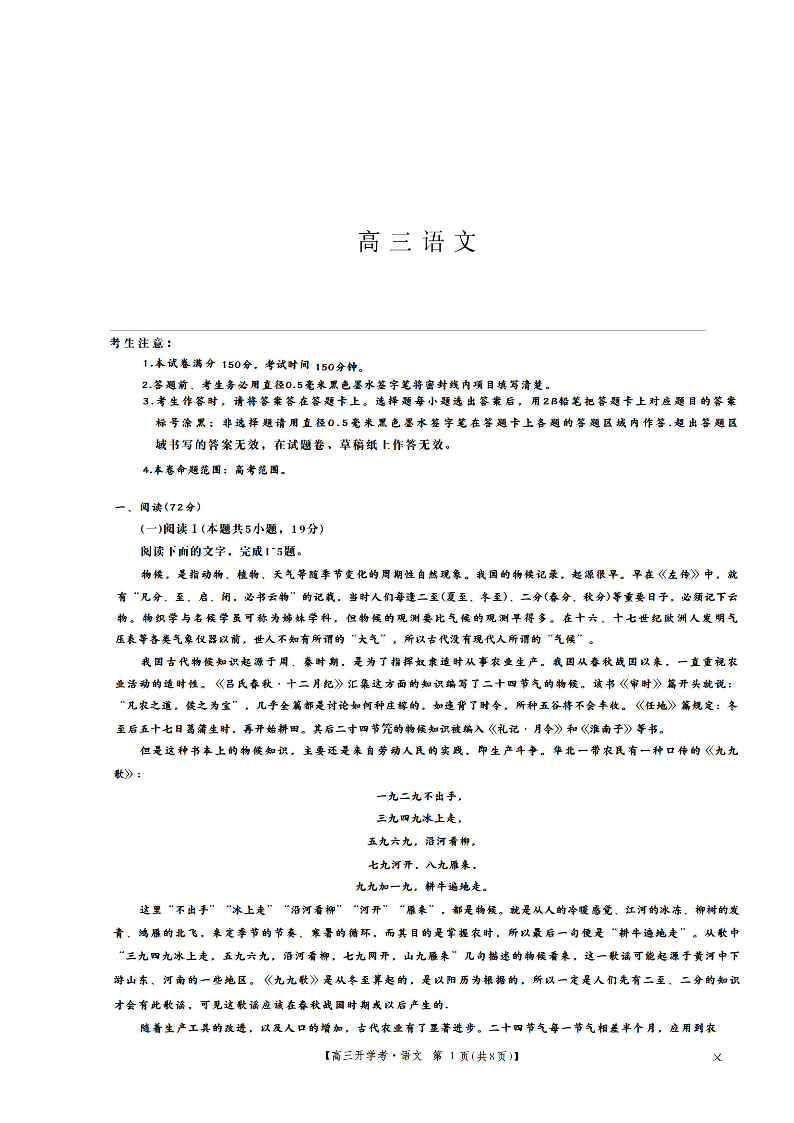 高三语文+答案--九师联盟2026届高三9月开学考试