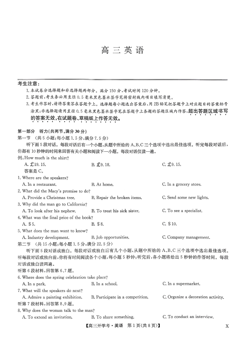 高三英语+答案--九师联盟2026届高三9月开学考试