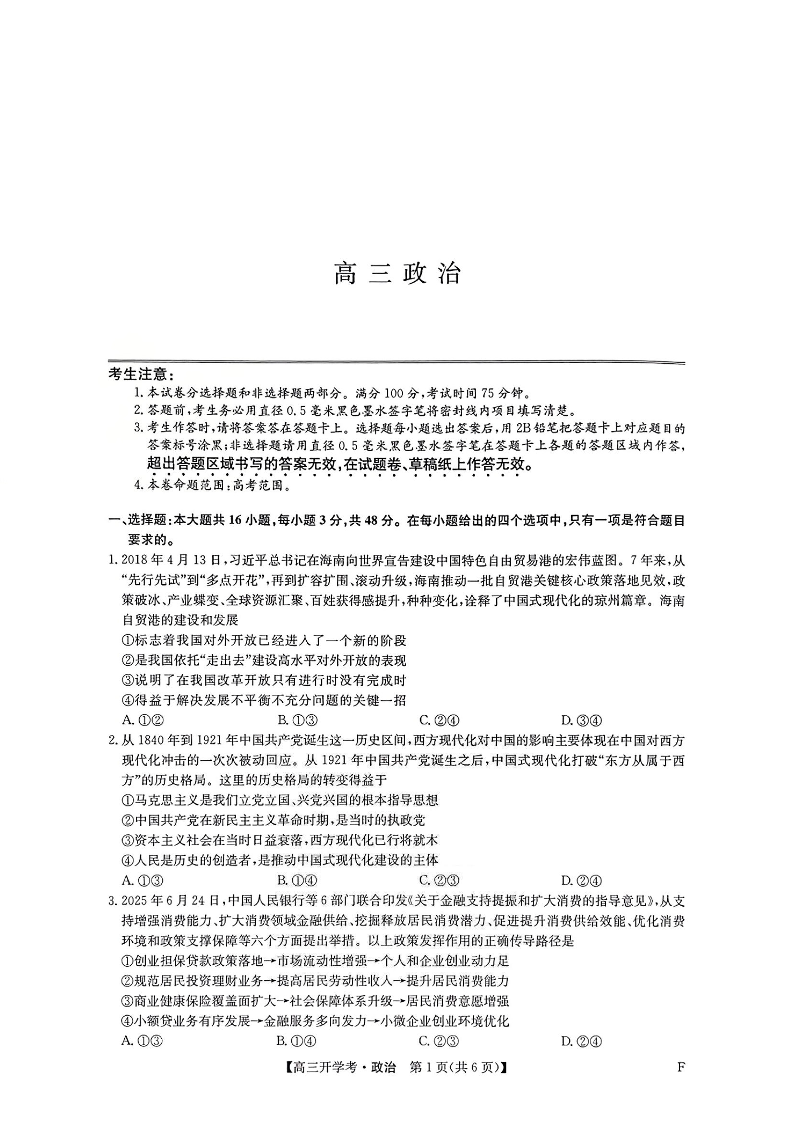 高三政治+答案--九师联盟2026届高三9月开学考试
