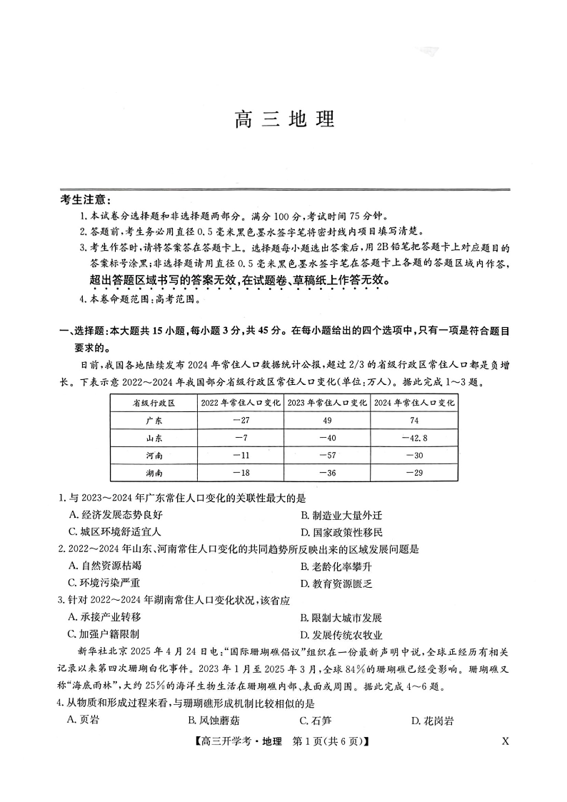 高三地理+答案--九师联盟2026届高三9月开学考试