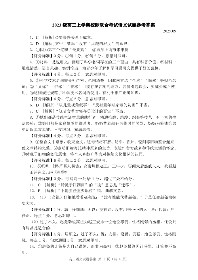 高三语文答案--山东省日照市2026届高三年级上学期9月开学校际联合考试