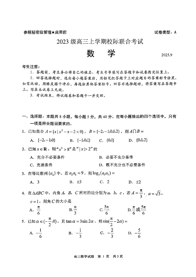 高三数学--山东省日照市2026届高三年级上学期9月开学校际联合考试