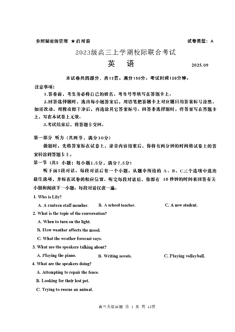 高三英语--山东省日照市2026届高三年级上学期9月开学校际联合考试