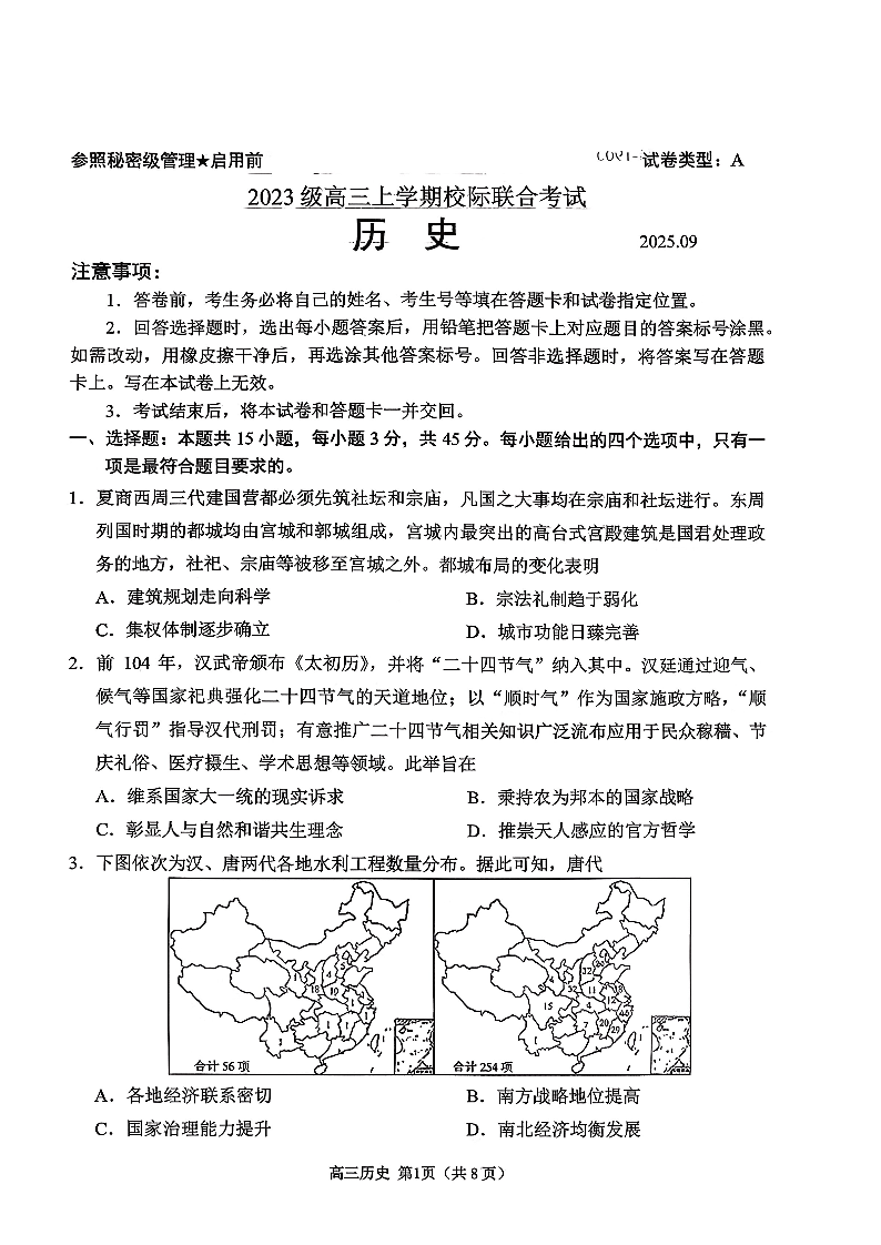高三历史--山东省日照市2026届高三年级上学期9月开学校际联合考试