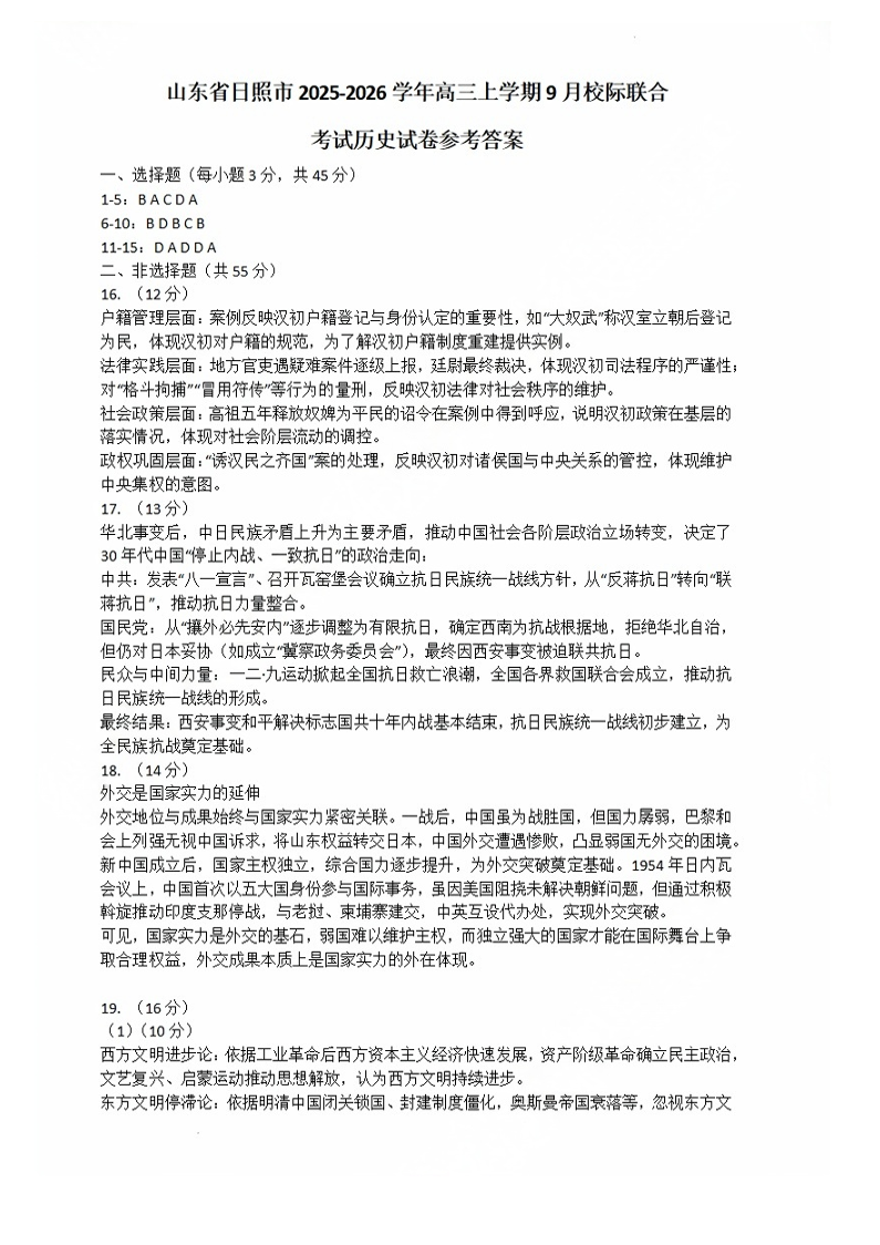 高三历史答案--山东省日照市2026届高三年级上学期9月开学校际联合考试