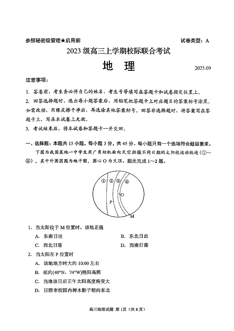 高三地理--山东省日照市2026届高三年级上学期9月开学校际联合考试