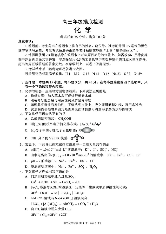 高三化学--四川省成都市蓉城名校联盟2026届高三上学期9月开学联考