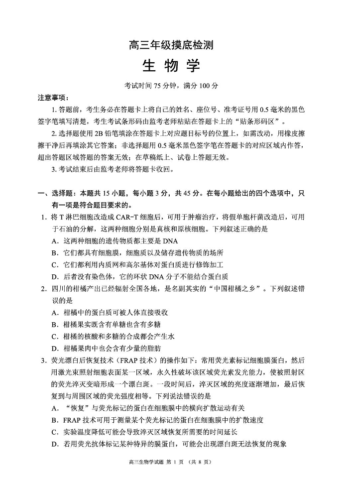 高三生物--四川省成都市蓉城名校联盟2026届高三上学期9月开学联考
